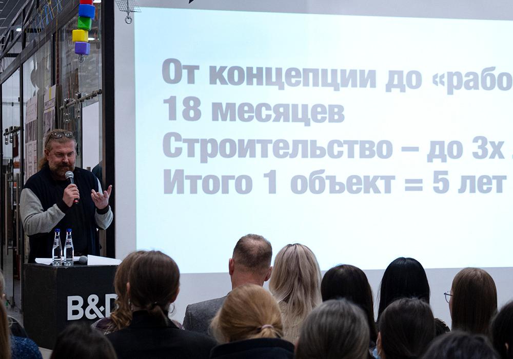 В первую очередь Александр призвал не отвлекаться от выбранного проекта, изучить все не только со своей профессиональной стороны, но и вникнуть в дело клиента. Спикер подчеркнул, что когда архитектор знает о чем волнуется клиент и предлагает ему пути решения – возникает доверие, необходимое для успешной реализации планов компании.