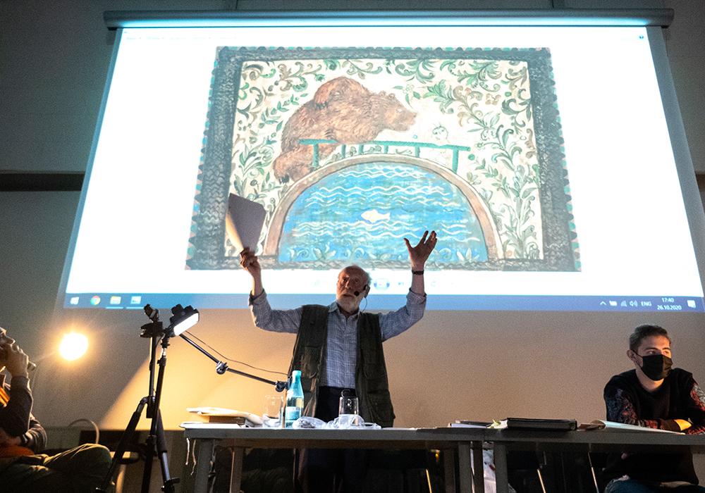 26 октября в рамках цикла лекций «Профессионалы» и по приглашению Михаила Алдашина – руководителя профиля «Анимация», состоялась встреча с режиссером-аниматором Юрием Норштейном. Выступление почетного гостя прошло в формате лекции на тему «Персонаж и пластика движения» с последующим мастер-классом.