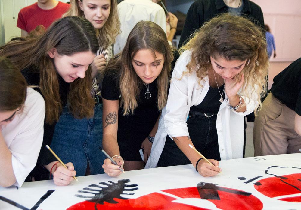 В первый учебный день студенты с головой окунулись в новый для себя мир: познакомились с преподавателями, сокурсниками и узнали о новых направлениях профессионального развития, которые им предстоит освоить. А студенты направления Графический дизайн успели даже создать плакат в технике трафаретной печати на мастер-классе Игоря Шичкова.