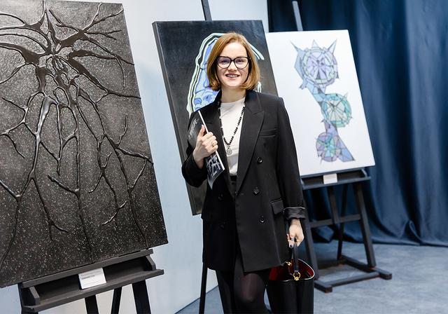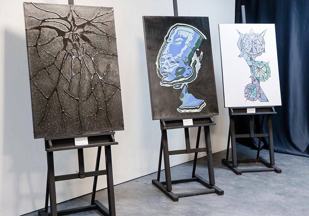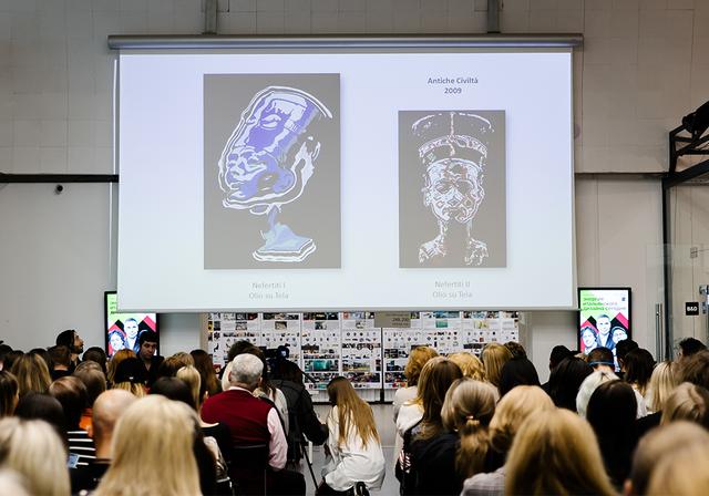 Массимилиано Робино представил свои работы – переосмысление иконического изображения египетской царицы Нефертити в стиле поп-арт, эксперимент с неравнозначными геометрическими формами и глубиной света, и смешанную технику с использованием промышленного материала – пластикового сплава.