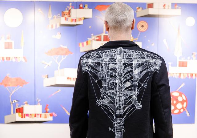 Параллельно с дискуссией в стенах Института был показан ряд выставок. Так, специально ко Дню итальянского дизайна в B&D галерея «Крокин» впервые представила работу Кирилла Рубцова, полиптих «Итальянское небо. Облака» (2021 г.). Рубцов многократно посещал Италию и любовался глубокой лазурью средиземноморского небосклона, в пространство которого он интегрирует своего персонажа – «русского робота».