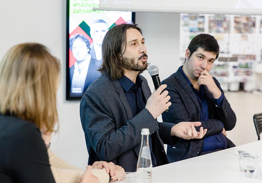 В public talk приняли участие Дарио Лугано, ведущий специалист генерального представительства WWTS в России, Марко Полимени, агент итальянских фабрик по производству керамической плитки, Массимилиано Робино, художник, график, дизайнер, и Бернардо Паоли, независимый консультант в fashion-образовании, основатель Studies & Careers и Studiare in Italia.