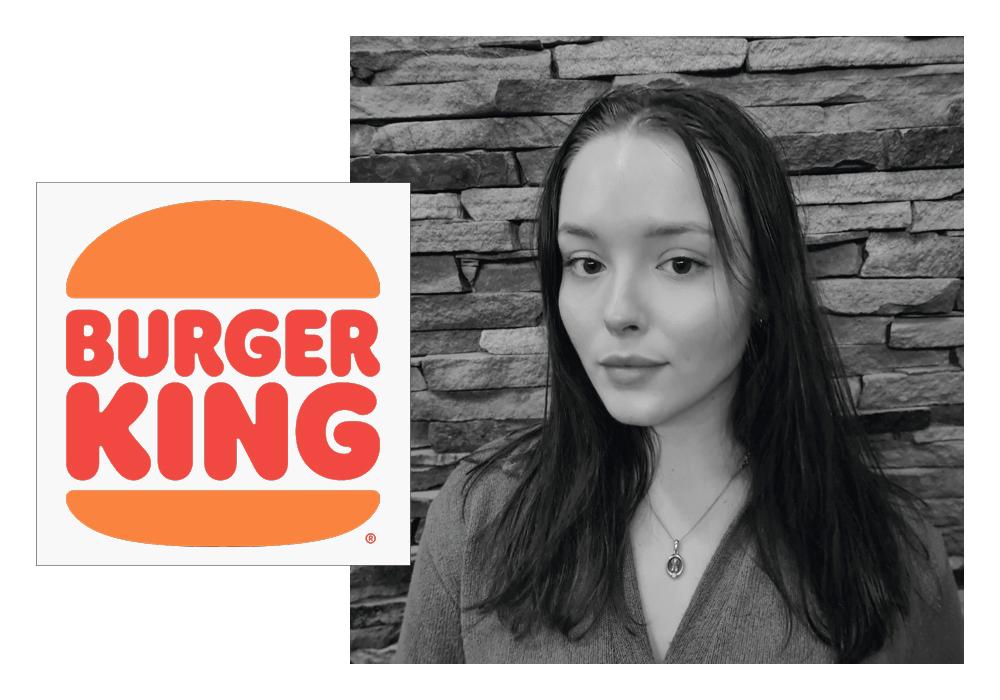 Александра: «Приглашение в Burger King, конечно! Гигантское количество работы в московском филиале американской компании, владельце глобальной сети ресторанов быстрого питания, специализирующейся на гамбургерах». На резюме нашей выпускницы Burger King вышел сам, а Саша успешно прошла там пять собеседований и два тестирования. «Я обожаю Burger King, это то место, которое сделало меня настоящим профессионалом. Я «влюбилась» в собственную начальницу, научилась у неё быстро и чётко работать, значительно выросла как маркетолог», – восхищается наша героиня. Будучи энергичным, креативным и очень активным сотрудником, она быстро освоила новое: научилась считать эффективность наружной рекламы, разобралась с непростыми внутренними процессами большой организации.
