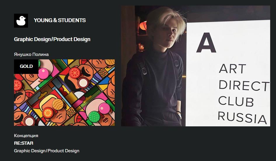 24 сентября состоялось награждение победителей конкурса ADCR Awards. Полина Янушко — выпускница профиля «Графический дизайн» получила золото в номинации «YOUNG & STUDENTS» за дипломный проект бренда энергетического напитка «RE:STAR».